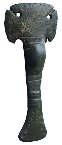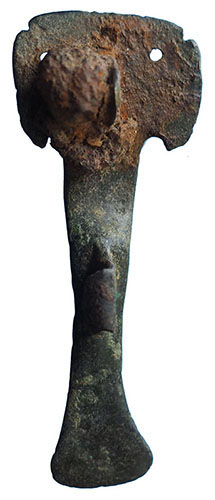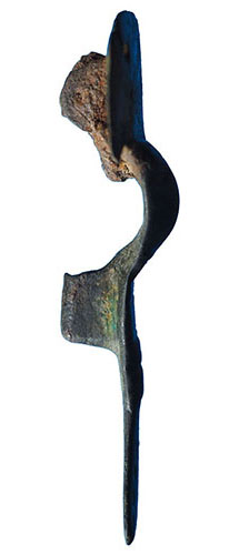 Anglo Saxon Small Long Brooch. A copper alloy small long brooch with trefoil head, arched bow and dove tailed shaped foot. Circa 6th century AD. North Yorkshire. 65 mm high. As usual the iron pin is missing but a large part of the spring remains. |