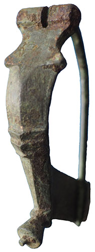 Roman Kraftig Profilierte Brooch. A well-made bronze Kraftig profilierte brooch with a sharply tapered, ribbed bow, pronounced moulded head, and a knobbed foot above an elongated catchplate. A classic, well-balanced example of this early Roman type. 1st century AD. See Richard Hattatt, Brooches of Antiquity, p. 35, no. 763. Length: 42 mm. Complete with its original working pin. |