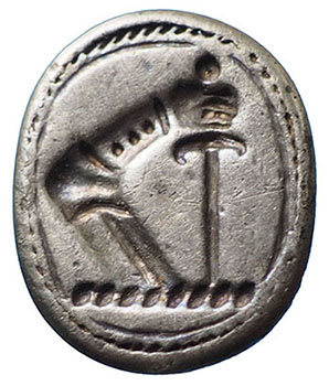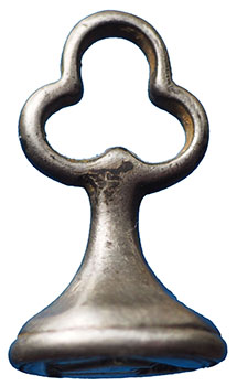 Post Medieval Silver Seal Matrix. A very good quality solid silver stamper type seal matrix, with oval base, tapered hexagonal handle and trefoil suspension loop. The base engraved with an arm clad in armour, holding a sword. 17th - 18th century. North Yorkshire. 14mm x 12mm base, 24mm high. |