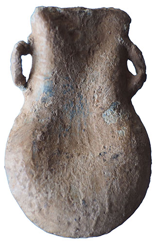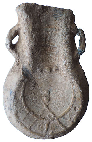 Medieval Pilgrim’s Ampulla. A complete medieval pilgrim ampulla from the shrine of Our Lady of Walsingham, cast in lead alloy and retaining both original angular suspension loops. One face carries a shallow, stylised design typical of late medieval ampullae. The reverse shows a hatched crescent with a central pellet and further pellets between the horns, with the inscription ‘WAL’ placed between two horizontal lines above — the standard attribution to Walsingham. A well-preserved and fully identifiable example. Circa 15th century. For closely related examples, see UKDFD 32061 and 55924, which show the same design and may well derive from the same mould. Lincolnshire find. 50 mm × 33 mm. |