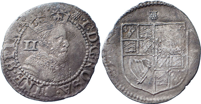 JAMES I. 1603-1625. Halfgroat. First coinage (1603-1604). First bust, II behind head. mm Thistle. Weight 0.8 g. Spink # 2649. Diameter 17.5 mm. |