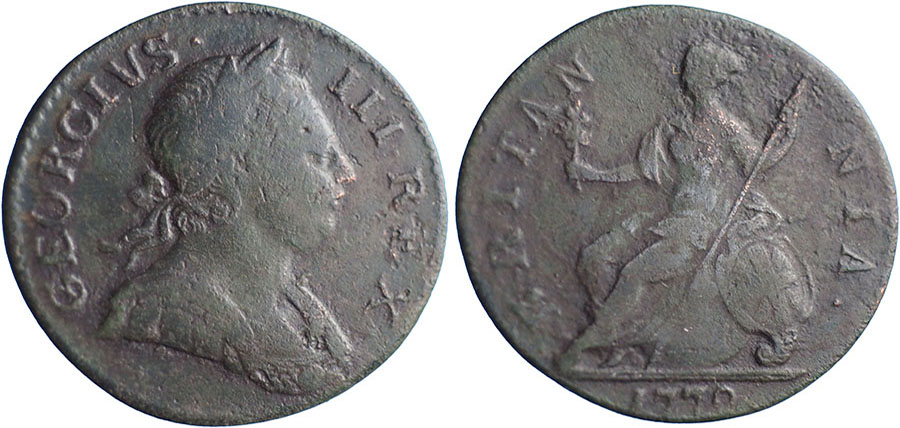 GEORGE III. 1760-1820. Halfpenny. First issue, Tower Mint, London. GEORGIVS III REX. Laureate and cuirased bust right. ® BRITANNIA. Britannia seated left, 1772 in exergue. Spink # 3774. |