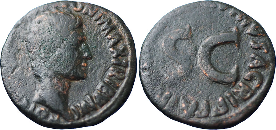 AUGUSTUS. 27BC-AD14. Æ As (26 mm). Moneyer P. Lurius Agrippa. CAESAR AVGVST PONT MAX TRIBVNIC POT, bare head of Augustus to right. ® P LVRIVS AGRIPPA III VIR A A A F F, around large SC. RIC I, 427. |