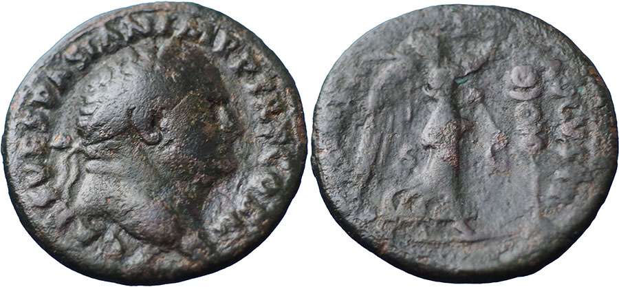 TITUS. 79-81 AD. Æ As (26 mm). As Caesar, AD 72. Struck under Vespasian. T CAES VESPASIAN IMP P TR P COS II, laureate head right. ® VICTORIA AVGVSTI S C, Victory walking right, about to crown a standard with wreath. RIC II, 453. Cohen 381. BMCRE 645. |