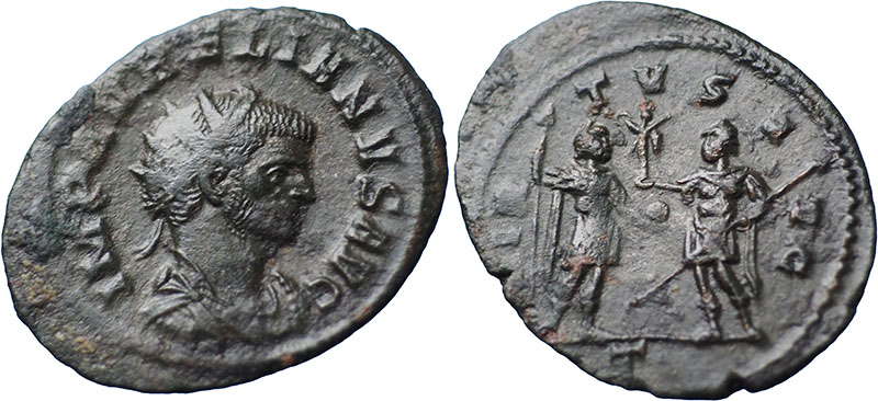 AURELIAN. 270-275 AD. Æ Antoninianus (20 mm). Mint of Mediolanum (Milan). IMP AVRELIANVS AVG, radiate, draped bust right. ® VIRTVS AVG, emperor standing right, holding sceptre and globe, receiving Victory from soldier opposite. Mintmark T. RIC V-1, 149. |