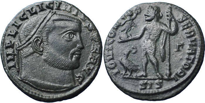 LICINIUS I. 308-324 AD. Æ Follis (20mm). IMP LIC LICINIVS PF AVG, laureate head right. ® IOVI CON-SERVATORI, Jupiter standing left, holding Victory on globe and sceptre, eagle with wreath at foot left. Gamma in right field. Mintmark SIS (Siscia). RIC VII, 8. Rated r1. |