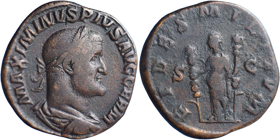 MAXIMINUS I. 235-238 AD. Æ Sestertius. MAXIMINVS PIVS AVG GERM, laureate, draped bust right. ® FIDES MILITVM S-C, Fides standing left, holding two standards. RIC IV, 78. |