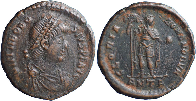 THEODOSIUS I. 379-395 AD. Æ 2 (22 mm). DN THEODO-SIVS PF AVG, pearl-diademed, draped and cuirassed bust right. ® GLORIA ROMANORVM, emperor standing facing holding labarum and globe. Mintmark ANTA (Antioch). RIC IX, 68a. |