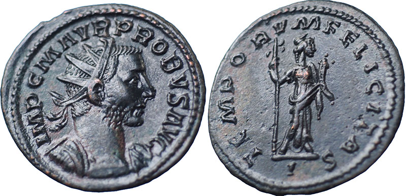 PROBUS. 276-282 AD. Æ Antoninianus (21 mm). Mint of Lyon. IMP C M AVR PROBVS AVG, radiate, cuirassed bust right. ® TEMPORVM FELICITAS, Felicitas standing right, holding caduceus and cornucopiae. Mintmark I. RIC V-2, 52. |