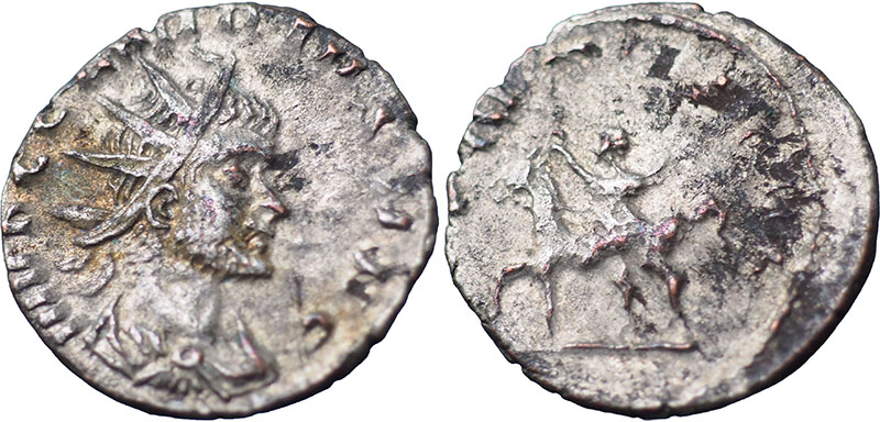 CLAUDIUS GOTHICUS. 268-270 AD. Æ Antoninianus (19 mm). Mint of Rome. IMP C CLAVDIVS AVG, radiate, draped and cuirassed bust right. ® ADVENTVS AVG, emperor on horseback left, holding sceptre and raising hand in salute. RIC V-1, 13. Heavily silvered. |