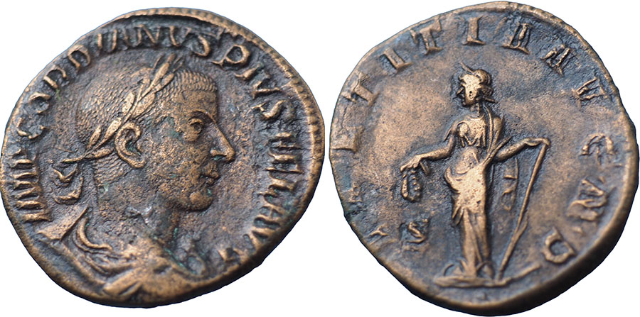 GORDIAN III. 238-244 AD. Æ Sestertius (30mm). IMP GORDIANVS PIVS FEL AVG, laureate, draped bust right. ® LAETITIA AVG N, S-C, Laetitia standing left holding wreath and anchor. RIC 300a. |