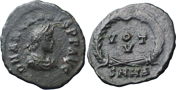 ARCADIUS. 383-408 AD. Æ 4 (14mm). D N ARCADIVS P F AVG, pearl-diademed, draped and cuirassed bust right. ® VOT V in laurel wreath. Mintmark SMHA (Heraclea). RIC IX, 18b. |