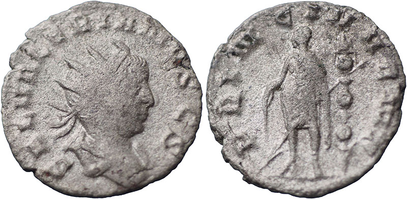SALONINUS. As Caesar 258-260 AD. Ar Antoninianus. Mint of Lugdunum (Lyons). SAL VALERIANVS CAES, radiate, draped bust right. ® PRINC IVVENT, prince standing left holding baton and transverse spear, one standard to right. RIC V-1, 10. |