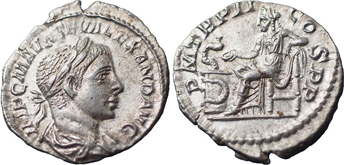 SEVERUS ALEXANDER. 222-235 AD. Ar Denarius. P M TR P II COS P P. Salus seated left, feeding serpent entwined around altar. RSC 239. |