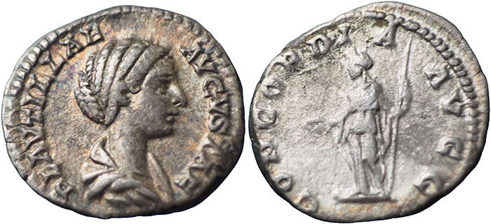 PLAUTILLA. Wife of Caracalla. Ar Denarius. CONCORDIA AVGG. Concordia, wearing diadem, standing half-left, holding patera and sceptre. RSC 2. |