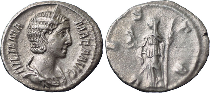 JULIA MAMAEA. Mother of Severus Alexander. Ar Denarius. VESTA. Vesta, veiled, standing half-left, holding palladium and sceptre. RSC 81. |
