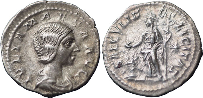 JULIA MAESA. Grandmother of Elagabalus. Ar Denarius. SAECVLI FELICITAS. Felicitas standing front, head left, sacrificing out of patera over lighted altar and holding long caduceus; in the field, star right. RSC 45. |