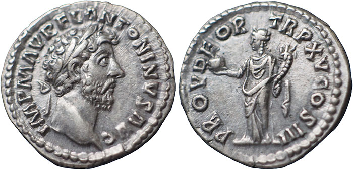 MARCUS AURELIUS. 161-180 AD. Ar Denarius. PROV DEOR TR P XV COS III. Provedentia standing left, holding globe and cornucopiae. RSC 508. |