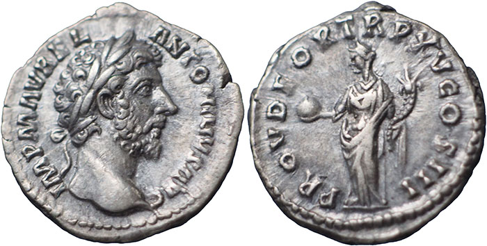 MARCUS AURELIUS. 161-180 AD. Ar Denarius. PROV DEOR TR P XV COS III. Provedentia standing left, holding globe and cornucopiae. RSC 508. |