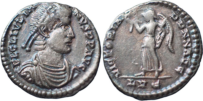 JULIAN. 360-363 AD. Ar Siliqua. FL CL IVLIANVS PP AVG, draped, cuirassed, pearl diadem, right. ® VICTORIA DD NN AVG, Victory walking left holding wreath and palm, one wing visible. Mintmark LVG (Lugdunum). RSC 58a. 17.5mm. Attractive piece with Good metal and old cabinet tone. |
