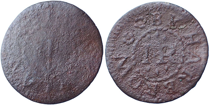 LEICESTERSHIRE. Market Harborough. 17th Century Token. Farthing. IOHN RYLAND, Arrow. ® BY HARBROW, I R in centre. Not listed in Norweb, Williamson or Dickinson. An unrecorded type by an unknown issuer. After some research I did find one other : See Noonans, 20 September 2023, Lot 1224. |