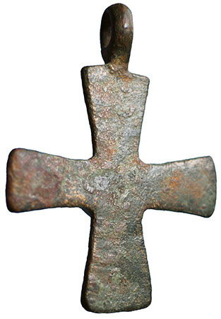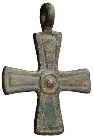 Byzantine Cross. A bronze cross decorated in the centre with a circular boss in relief. 8th-12th Century AD. Europe. 37.5 mm (h), 28 mm (w). Complete with suspension loop and wearable. |