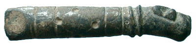 Roman Knife Handle. A fine bronze knife handle, the body engraved with a feather pattern, and the terminal with an animals head, possibly a lioness. 1st -2nd century AD. 53 mm long. Some of the original tinned surface remains. |