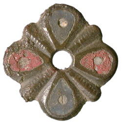 Roman Decorative Mount. A bronze decorative mount with petal shaped sections of red and blue enamel. On the reverse are two 'T' shaped studs for fixing to leather. 1st-2nd Century AD. 21 mm diameter. Complete and attractive. |