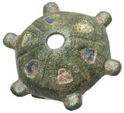 Roman Enamelled Stud. A bronze enamelled domed stud, decorated with six triangular recesses that have very good traces of alternating blue and red enamel still in place. 1st-2nd Century AD. 27 mm diameter. Complete with the two 'T' shaped fixing lugs on the rear. |