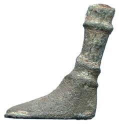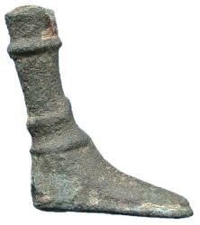 Roman Knife Handle. A copper-alloy knife or razor handle in the form of a leg and foot wearing sandal. 1st - 4th century AD. PAS # SWYOR-B98CF4. Bassetlaw district, Nottinghamshire. 22 mm long. A rare form of knife / razor handle recorded with the Portable Antiquities Scheme. |