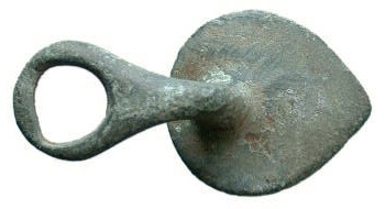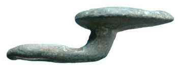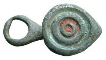 Celtic / Roman Button and Looped Fastener. A Copper alloy button and looped fastener in the shape of an eye. The central section is decorated with two concentric rings of enamel. Circa AD 70 - 150. 33 mm x 18 mm. Complete. |