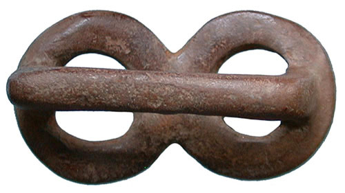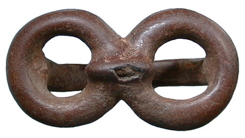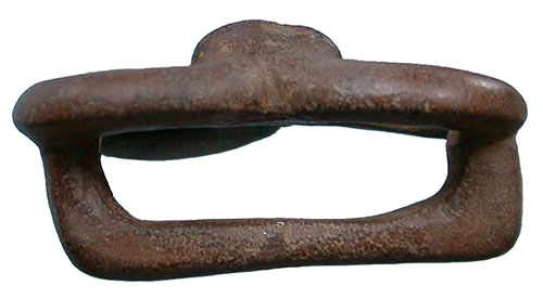 Celtic / Roman Strap Fitting. A copper alloy belt mount or strap slide from the late Iron Age to early Roman period. The design consists of a double loop ('figure of eight') with moulded frontal ridge, on the reverse there is a large rectangular loop. 1st - 2nd century AD. UKDFD 47691. Colne Lancashire. 32.7mm x 17.5mm x 16.3mm. Complete. |