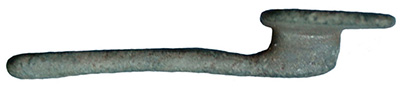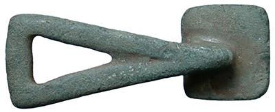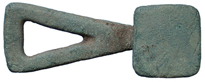 Roman Button and Looped Fastener. A Copper alloy button and looped fastener with plain rectangular head and triangular loop. Circa late 1st to 2nd century AD. See: Wild J.P., Button-and-Loop Fasteners in the Roman Provinces, Britannia, Vol. 1, (1970), Class VIb. 40 mm x 15 mm. The exact function of these items is uncertain. They may be clothing fasteners, but other theories include their possible use on horse harness or sword scabbards. |