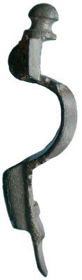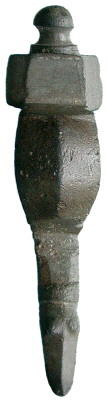 Anglo Saxon Cruciform Long Brooch. A bronze cruciform long brooch with a single knob decorating the head and stylised animal head decorating the foot. 5th-6th Century AD. 60 mm high. Iron pin missing otherwise complete. |