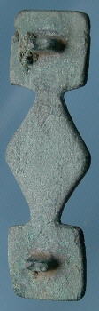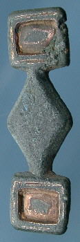 Anglo Saxon Bronze Mount. An Anglo Saxon bronze mount with lozenge shaped body and recessed, gilded square terminals. On the reverse there are two small fixing lugs. 8th - 9th century AD. 37 mm x 12 mm. |