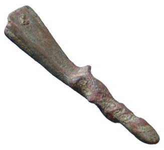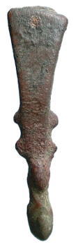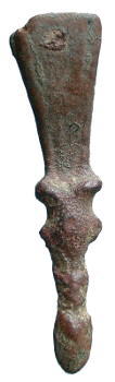 Anglo Saxon Strap-end. A copper alloy zoomorphic strap-end. The central section and terminal end are decorated with stylised animal-heads. The wedge-shaped attachment end is split to accommodate the strap with a single rivet. 9th-10th Century AD. Thomas Class B, Type 4 (Multi-headed); Haldenby Group 13 (Animal mask). Lincolnshire. 43 mm x 12 mm. |