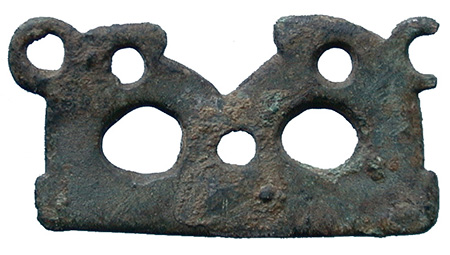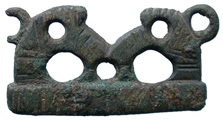 Anglo Saxon Wrist clasp. An early Anglo-Saxon cast copper-alloy wrist clasp. The decoration consists of two nose to nose open-work horse's heads with their ears serving as stitching loops. The back of the clasp shows traces of tin where the hook or eye would have been fixed. Late 5th - 6th century AD. UKDFD # 50474. Lincolnshire. 30mm x 16mm. |