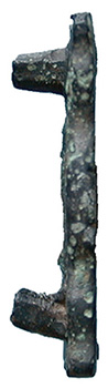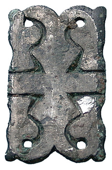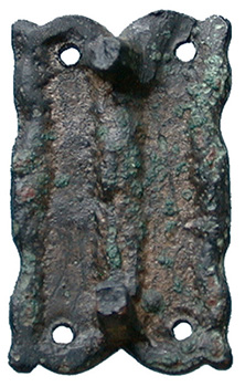 Anglo Saxon Zoomorphic Mount. A rectangular copper-alloy mount engraved with four back to back stylised horses heads. The surface still retains nearly 100% of the heavily tinned / silvered decoration. An interesting piece with two fixing pins on the reverse, most probably for fitting to leather. Circa 5th - 6th century AD. North Yorkshire. 23mm x 13mm. |