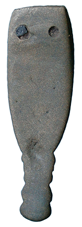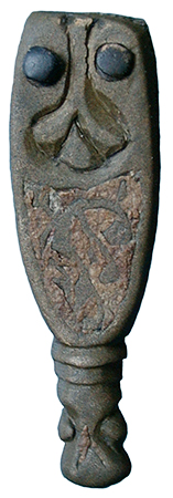 Anglo Saxon Strap-end. A copper alloy strap-end with a stylised animal head terminal. The body is decorated with a crouching, left-facing mythical beast in the Trewhiddle-style. The body and animal head still retains nearly all of the pale yellow enamel. 8th-9th Century. Thomas Class A, Type 1. North Yorkshire. 39 mm x 12 mm. Complete with both original rivets and an overall light green patina. A superb example of this type. |