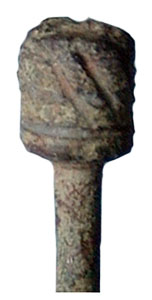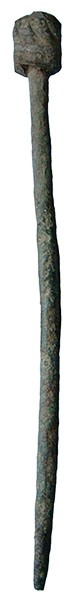Anglo Saxon Bronze Pin. A bronze pin with barrel shaped head decorated with fine lines and groves. 8th-10th Century. Lincolnshire. 54mm in length. |