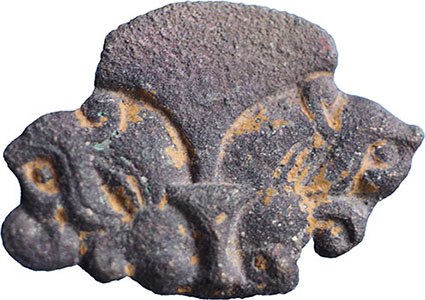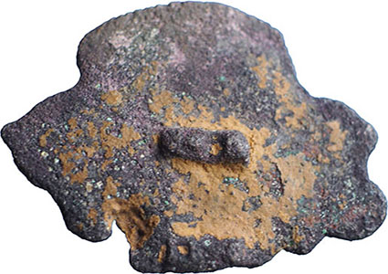 Anglo Saxon Cruciform Side Knob. A cast copper-alloy side knob from a large florid cruciform brooch, with chip-carved decoration, spatula terminal, stylised human face and interlaced ribbon patterns. On the reverse are the remains of the two lugs for the axis bar. 6th -7th century AD. Recorded at PAS: SWYOR-A59B17. Found north Lincolnshire in 2010. 22mm x 31mm. |