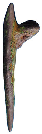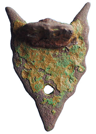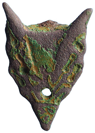 Viking Stirrup Mount. A copper alloy stirrup mount in the form of a facing animals head, possibly a wolf, with pointed ears and snout. 10th-11th Century AD. Williams Class A, Type 7. Lincolnshire. 40 mm high x 27 mm wide. Complete. |