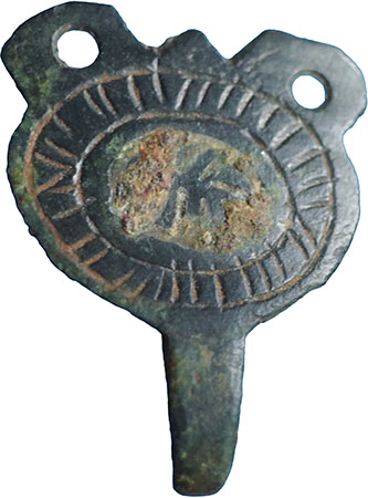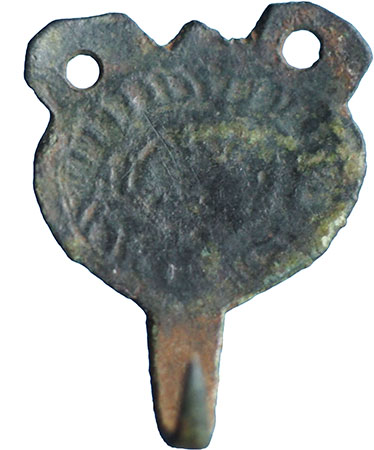 Anglo Saxon Dress Fastener. A copper alloy dress fastener with circular body decorated with a ring shaped rope design, complete with hooked tag and two pierced lugs for attachment. Circa 9th to early 12th century AD. Cf. Brian Read, Hooked-Clasps & Eyes, No. 114. 22 mm x 17 mm. |