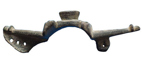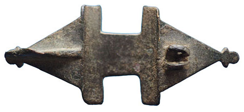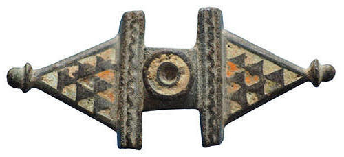 Roman Equal-Ended Brooch. A good example of a well-preserved Roman equal-ended brooch with triangular terminals retaining areas of geometric enamel inlay. Central rectangular panel with raised circular boss. 2nd–3rd century AD. 50 mm long. Complete apart from the pin. An attractive example with good surviving enamel. |