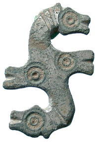 Roman Zoomorphic plate brooch An unusual style bronze zoomorphic plate brooch decorated with four animal heads. 2nd Century AD. Europe. 36 mm long. Iron pin missing otherwise complete, much of the bright tinned surface intact. |