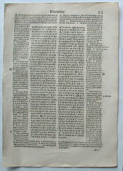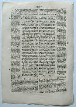Medieval Printed Bible Leaf. KOBERGER BIBLE - Printed in 1487. Original leaf from the bible in Latin (Biblia Latina) printed by Anton Koberger of Nuremburg in 1487. Referance: Darlow and Moule #6085 (note). This leaf consists of text printed in gothic letter in two columns with central text block. |