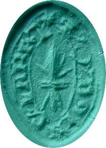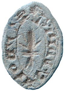 Medieval Lead Vesica Seal Matrix. A lead vesica seal matrix with personal inscription around edge, the design in the centre is a fleur-de-lis. 12th-14th Century. 26 mm long. |