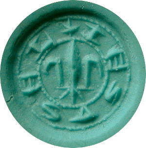 Medieval Bronze Stamper Seal Matrix. A very good quality bronze stamper type seal matrix with hexagonal stem and suspension loop. Inscribed * IESVSAL. The design in the centre is fleur-de-lis. Circa 14th century. 16 mm diameter, 18 mm high. |