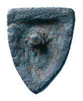 Medieval Heraldic Stud. A small bronze shield shaped heraldic stud, the coat of arms consisting of three bars. Complete with single fixing rivet. Circa 13th - 14th century. Lincolnshire. 10.5mm x 8.5mm. Attractive green patina. |