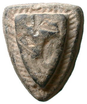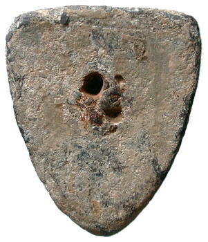 Medieval Trade Weight. A good sized, shield shaped lead trade weight, decorated with a lion rampant on a raised stepped shield. There are remains of an iron attachments on the rear. 110.0g. 14th-16th Century. 42mm x 35mm x 14mm. |